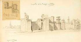 En el croquis realizado a mano alzada se observa el frontal del edificio desde la fachada Este, la que ven los viajeros que llegan de San Martín de Unx, y también hay un pequeño despiece de una desmoronada torre de los Cuatro Vientos (que el autor bautiza como “torre de los trovadores”) y, al fondo, la de la Atalaya, así como detalles de remates.